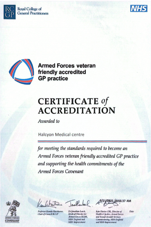 Halcyon Medical Centre is proud to announce that we have been officially awarded Veteran Friendly Accreditation. This certification recognises our ongoing commitment to providing dedicated care and support to veterans and their families. Our team is trained to identify, understand, and respond to the specific health needs of those who have served in the armed forces, ensuring they receive the right care, support, and signposting when needed.