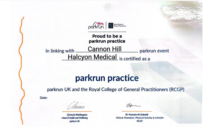 Halcyon Medical Centre is now a certified Parkrun Practice, proudly linked with Cannon Hill Parkrun. This initiative encourages staff, patients, and the wider community to improve health and wellbeing through regular physical activity in a friendly, inclusive environment.